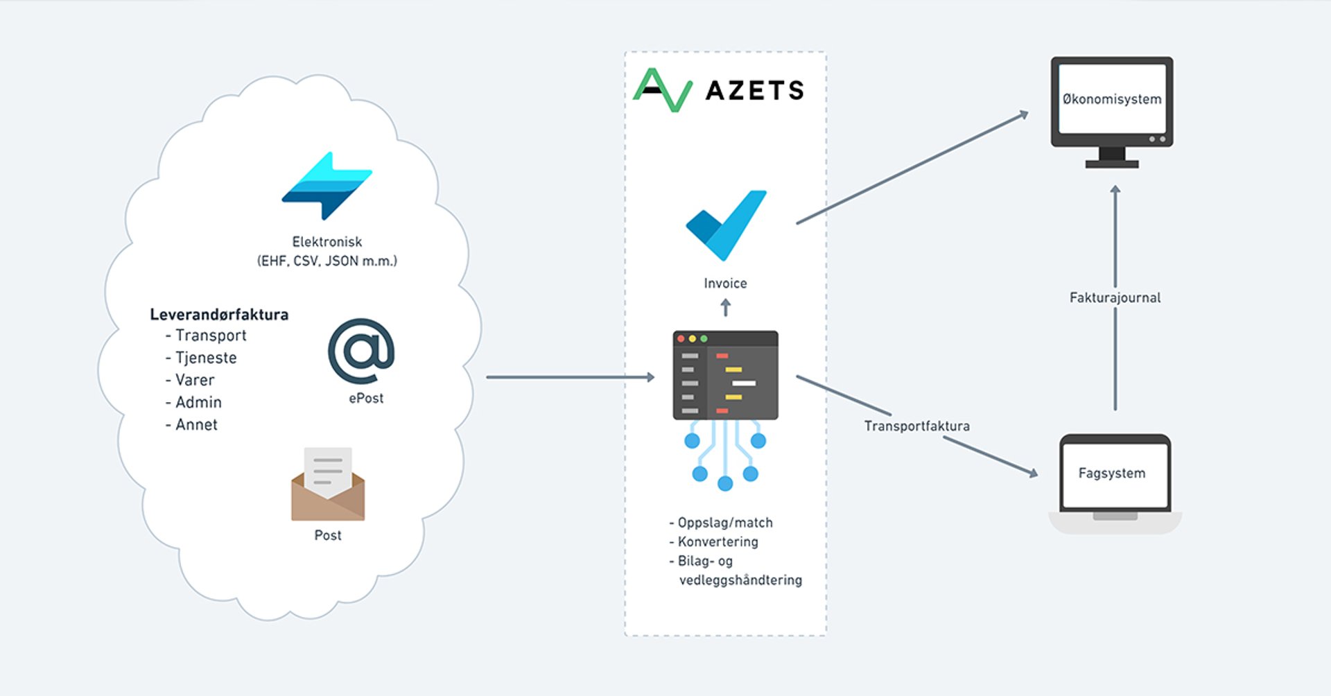 I den nye løsningen, sørger Azets for at alle fakturaer, uansett format og sendemåte, blir korrekt digitalt sortert og automatisk distribuert til økonomisystem eller fagsystem.